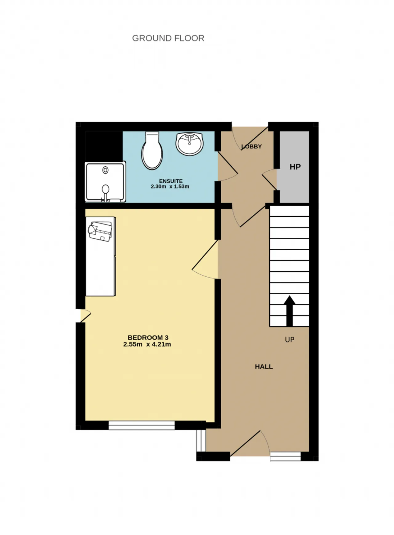Guest WC 2.5m x 1.4m A Jack & Jill style bathroom, accessed from the hallway as well as through the downstairs, double bedroom. Comprises of a WC, wash hand basin and a shower. Finished with tiled flooring and partly tiled walls.