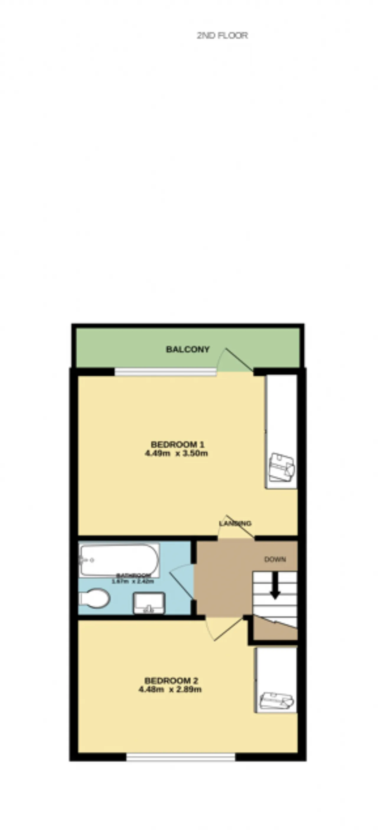 Bedroom 1 4.4m x 2.8m Situated on the top floor of the house, with oak flooring and fitted wardrobes. Enjoys access to a private, easterly facing balcony to the rear of the house.