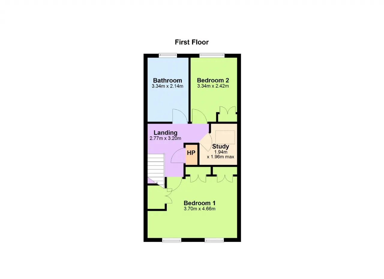 Study 1.94m x 1.96m Study with Velux roof window; built-in desk, shelving and wardrobe; access to attic. (Originally the main bathroom.)