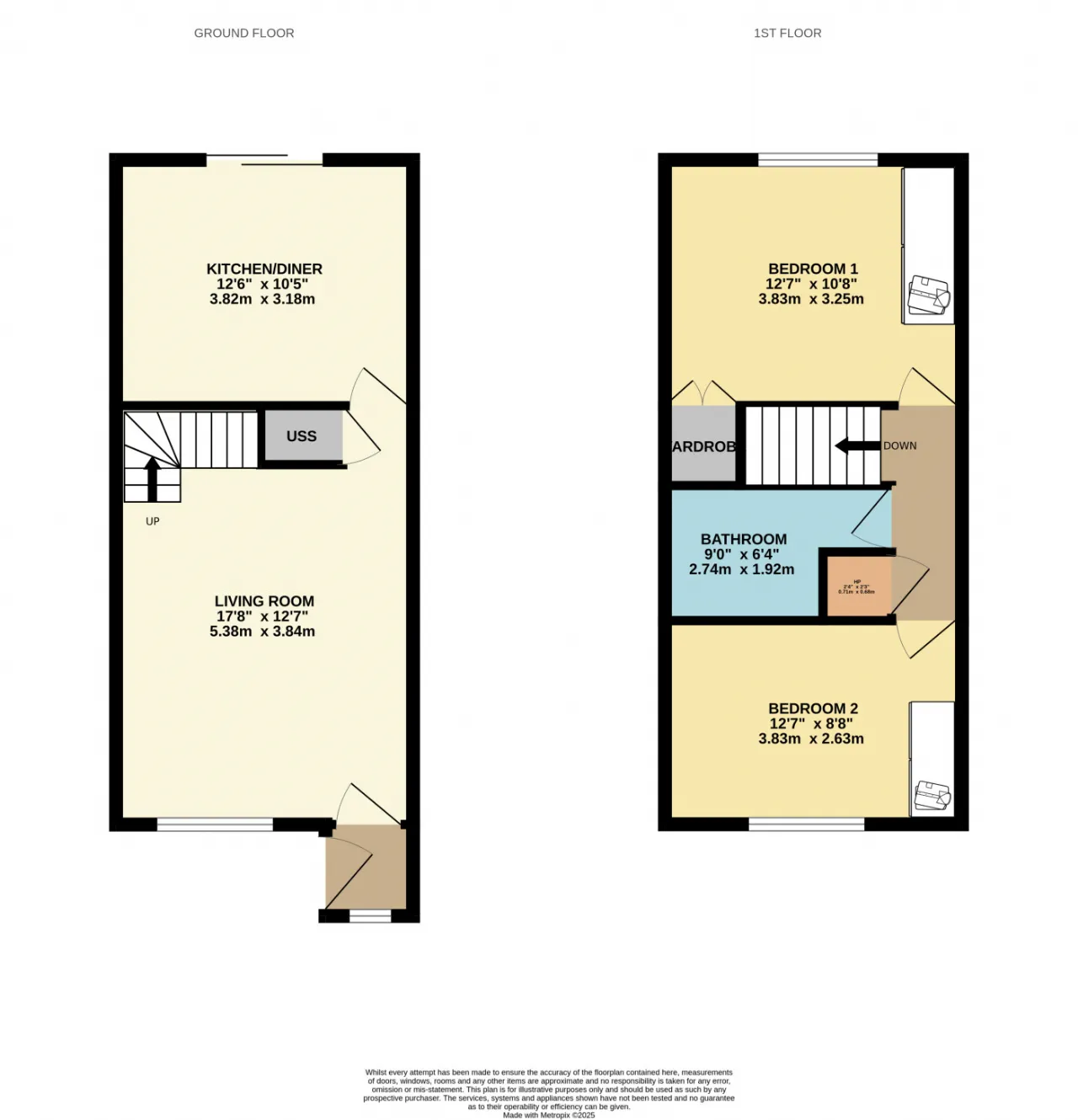 Bedroom 2 3.83m x 2.63m Located to the front, built in wardrobes, Carpet flooring.