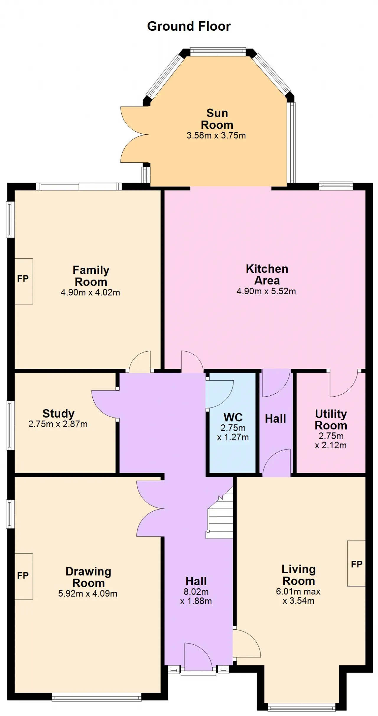 Drawing Room: Large reception room at the front of the house with ceiling coving and centre rose. Coal effect gas fire with black marble inset with neat, white marble surround. Large picture window and feature porthole window.