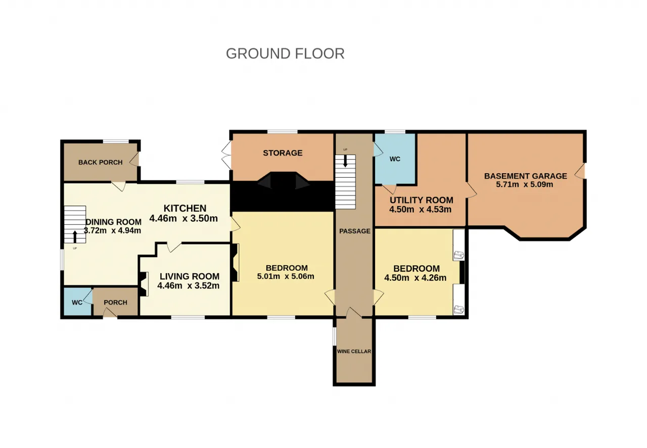 Ascending a graceful flight of stone steps, you’re welcomed to the house by an elegant entrance, the elevated position offering a sense of arrival and grandeur as the front door opens into a bright, inviting hallway. There are two large reception rooms off the hallway featuring original open fireplaces with large sash windows that flood each room with natural light. To the rear of the property is a bright and airy open plan kitchen cum dining/family room featuring a Stovax high efficiency wood burning stove. On the basement level there are two large double bedrooms and a wine cellar to the front of the house and a generously sized utility room includes a walk-in shower and a separate wc with direct access to the basement garage and out to the garden at the rear of the property. Upstairs the two main bedrooms enjoy a picturesque outlook over mature gardens with views of the sea beyond. The primary bedroom suite features a generous walk-in closet and a spacious en-suite bathroom. The second double bedroom also offers an en-suite and a smaller built-in closet.