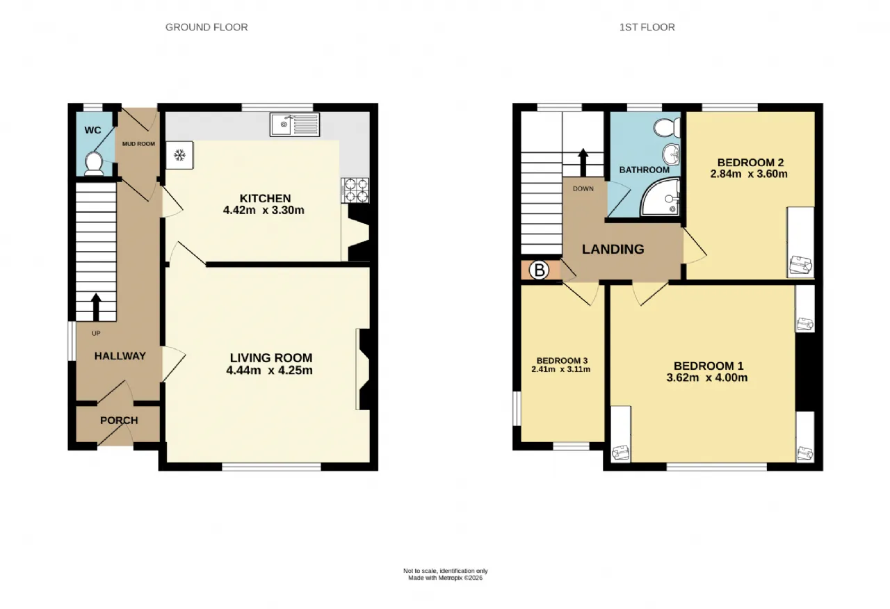 Upon entering this charming property, you are welcomed into a light-filled and spacious entrance hall with stairs rising to the first-floor landing. The hallway provides access to the main living room and kitchen, as well as an inner hallway leading to the downstairs WC and a door opening out to the rear garden.. The living room itself is of good size with a large front facing window, feature fireplace with inset fire & tiled hearth, decorative coving, wall mounted radiator, carpeted floor coverings.