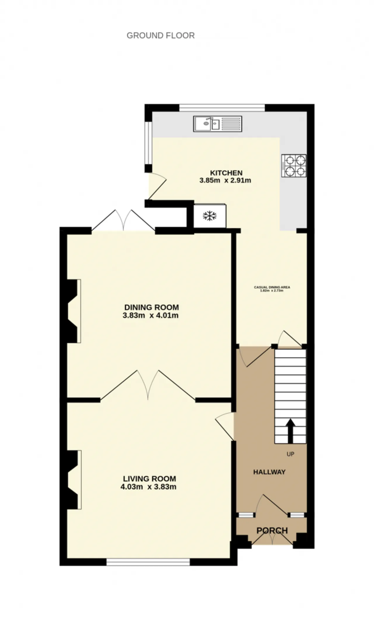 Living Room 4.03m x 3.83m Large front facing window, feature fireplace with inset fire & tiled hearth, original period coving, wall mounted radiator, hardwood flooring and double doors opening to the dining room.