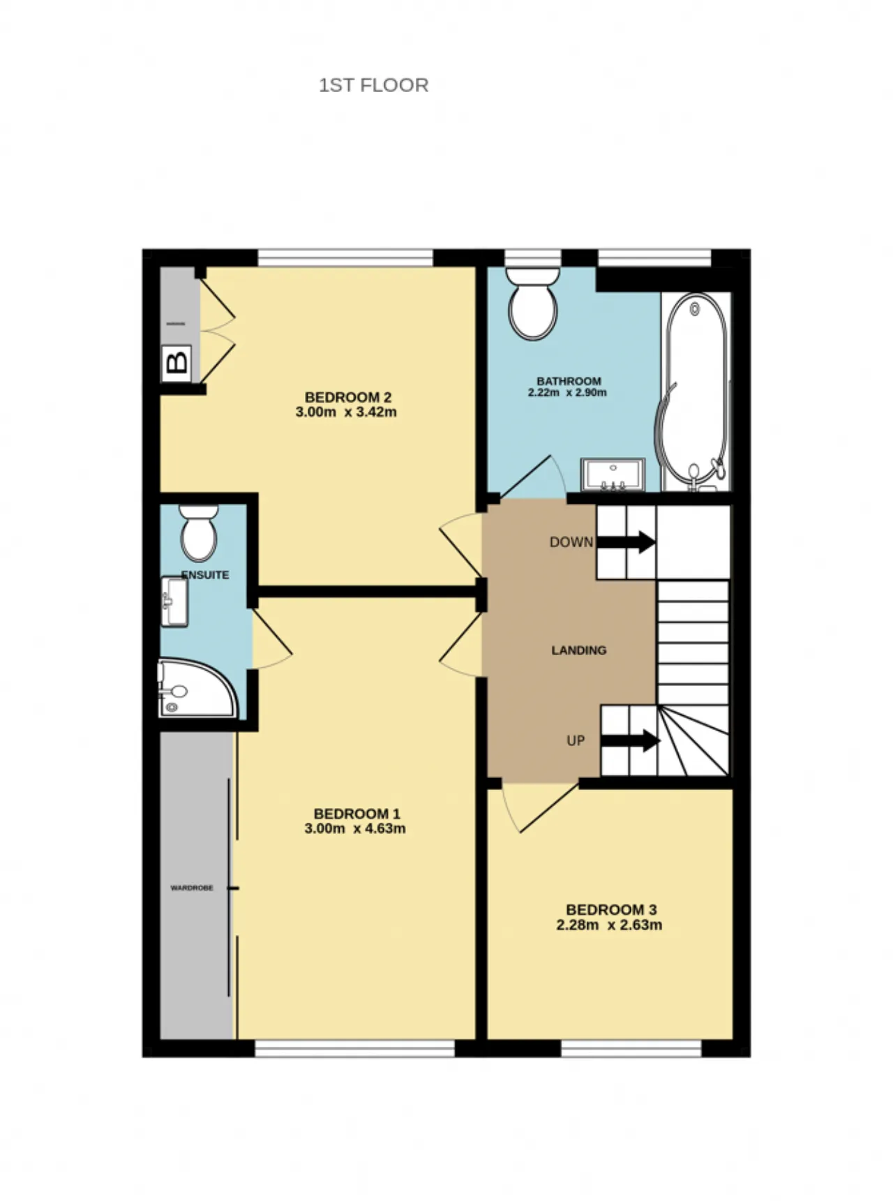 Bedroom 1 3.00m x 4.63m Generously sized double bedroom with a front-facing window, ample built-in sliderobes wardrobes, wall mounted radiator, laminate flooring and opening to a well-appointed en-suite bathroom.