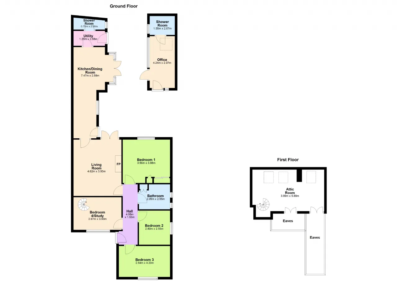 Bedroom 4/ Study generous single room to the front with exposed timber floors, fitted wardrobe and a spiral staircase to the attic room.