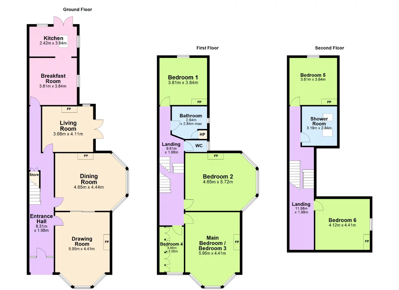 Main Bedroom / Bedroom 3: Large double room to front with bay window, open fire with tiled surround, coving, frieze and picture rail.