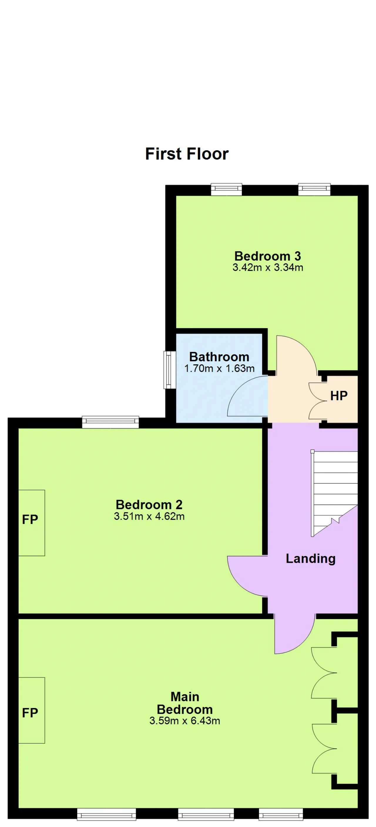 Main Bedroom 3.59m x 6.43m Large double room spanning the width of the house with three windows overlooking the avenue. Includes fitted wardrobes and open cast iron fireplace with tiled inset and wooden mantle.