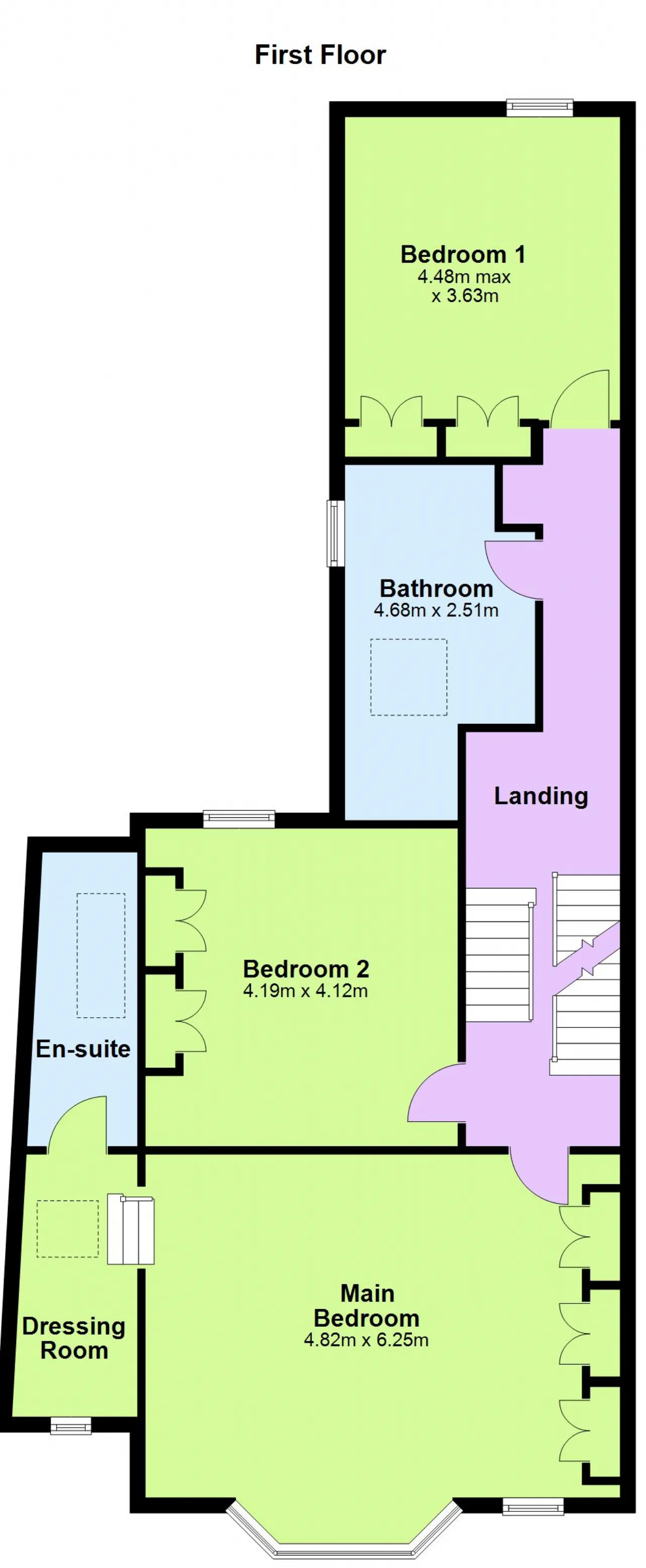 Bedroom 1 Main bedroom spanning the width of the house with large bay window overlooking Mount Eden Road and adjacent playing fields. Bespoke fitted wardrobes and original fireplace with decorative tiled inset, slate hearth and marble surround. Steps lead down to additional dressing area with extra storage and door to
