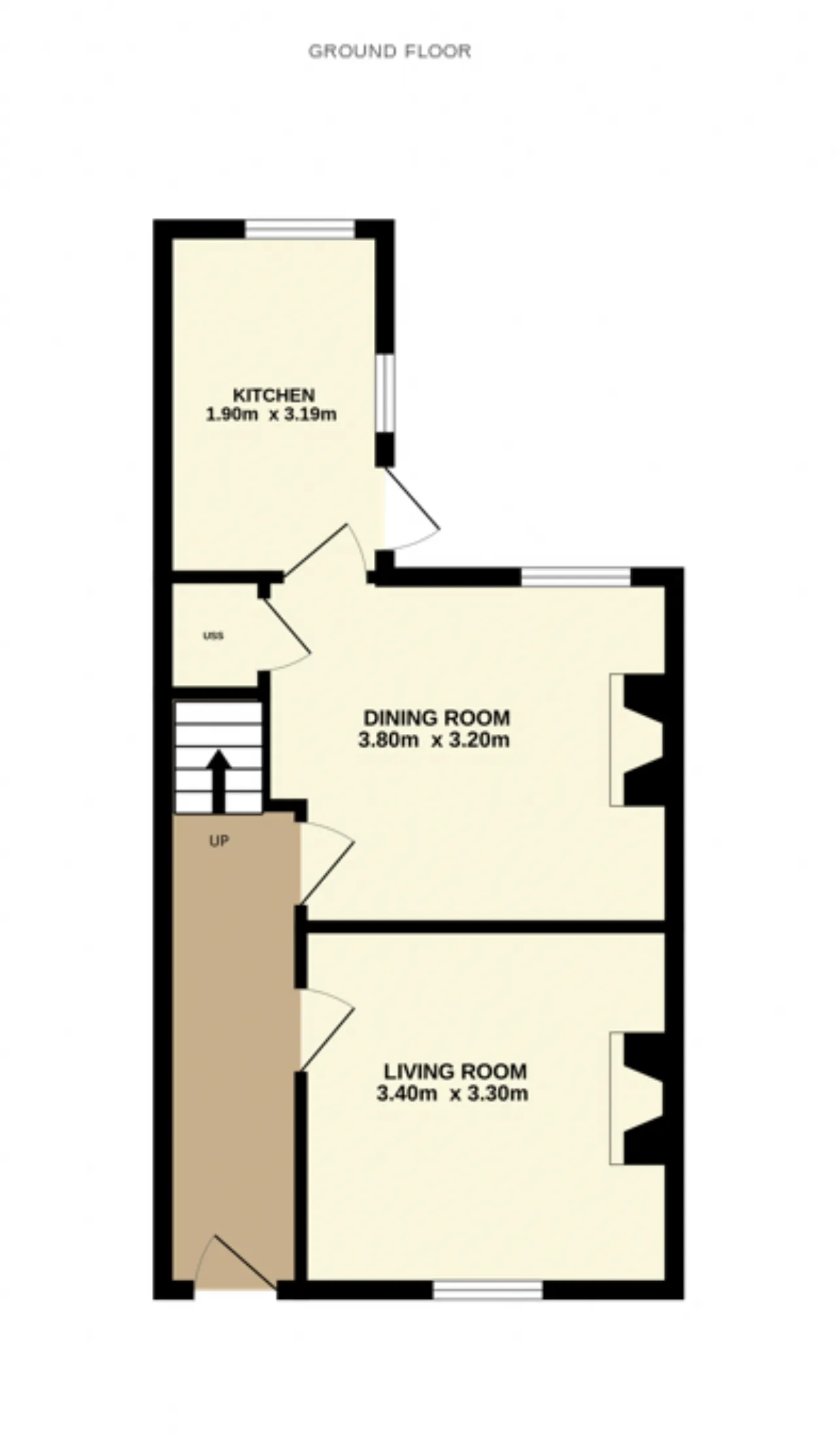 Dining Room 3.80m x 3.20m with wooden flooring, Victorian style fireplace and access to under stairs storage.
