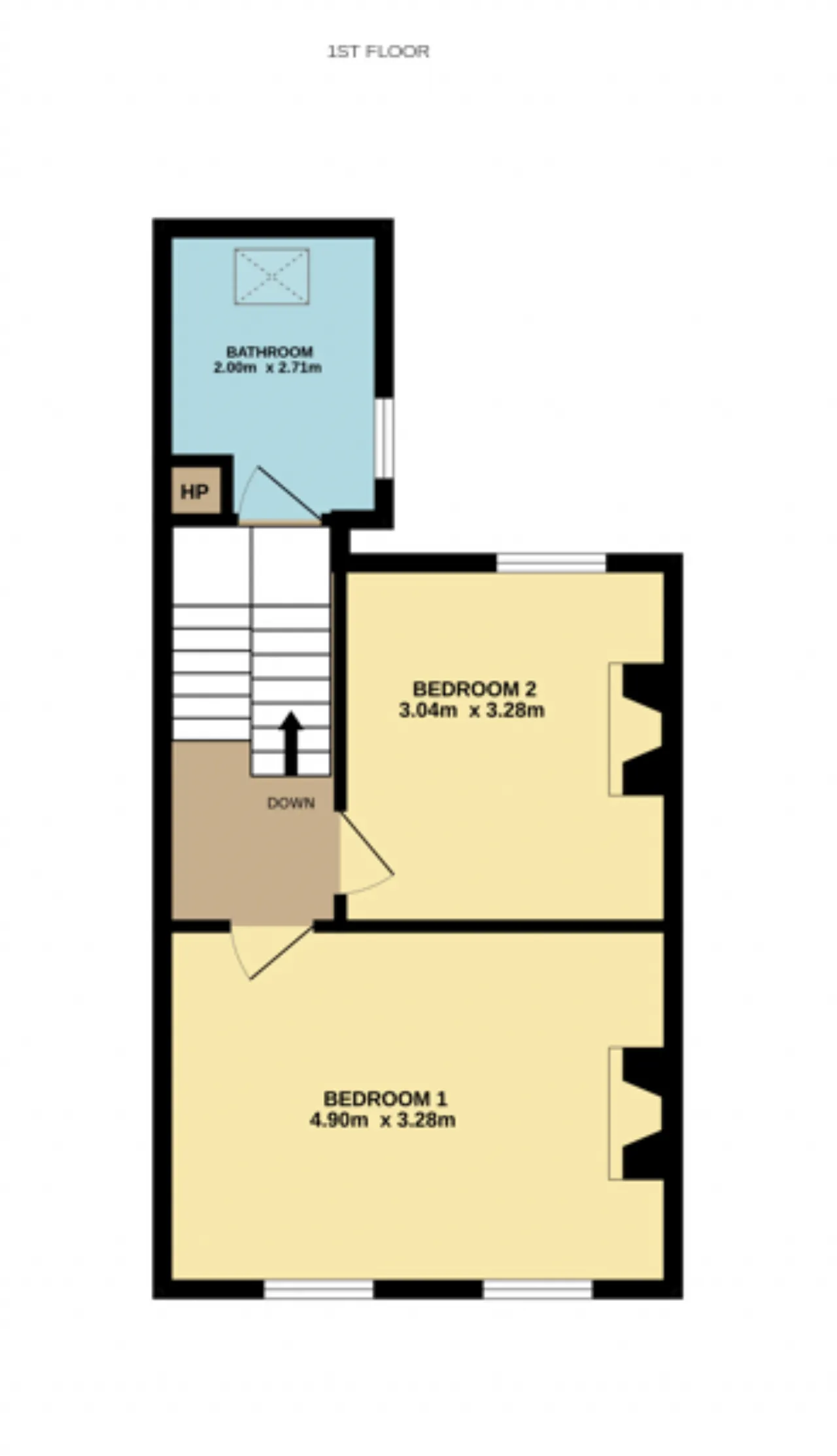 Bedroom 1 4.90m x 3.28m located at the front of the property spanning the width of the house featuring carpet flooring and original fireplace.