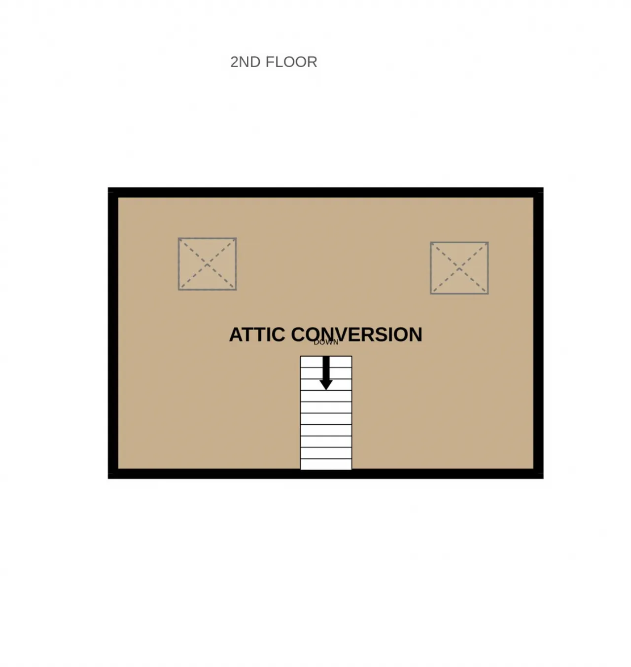 Attic Conversion 5.8m x 3.5m Wooden flooring with skylights and eves storage.
