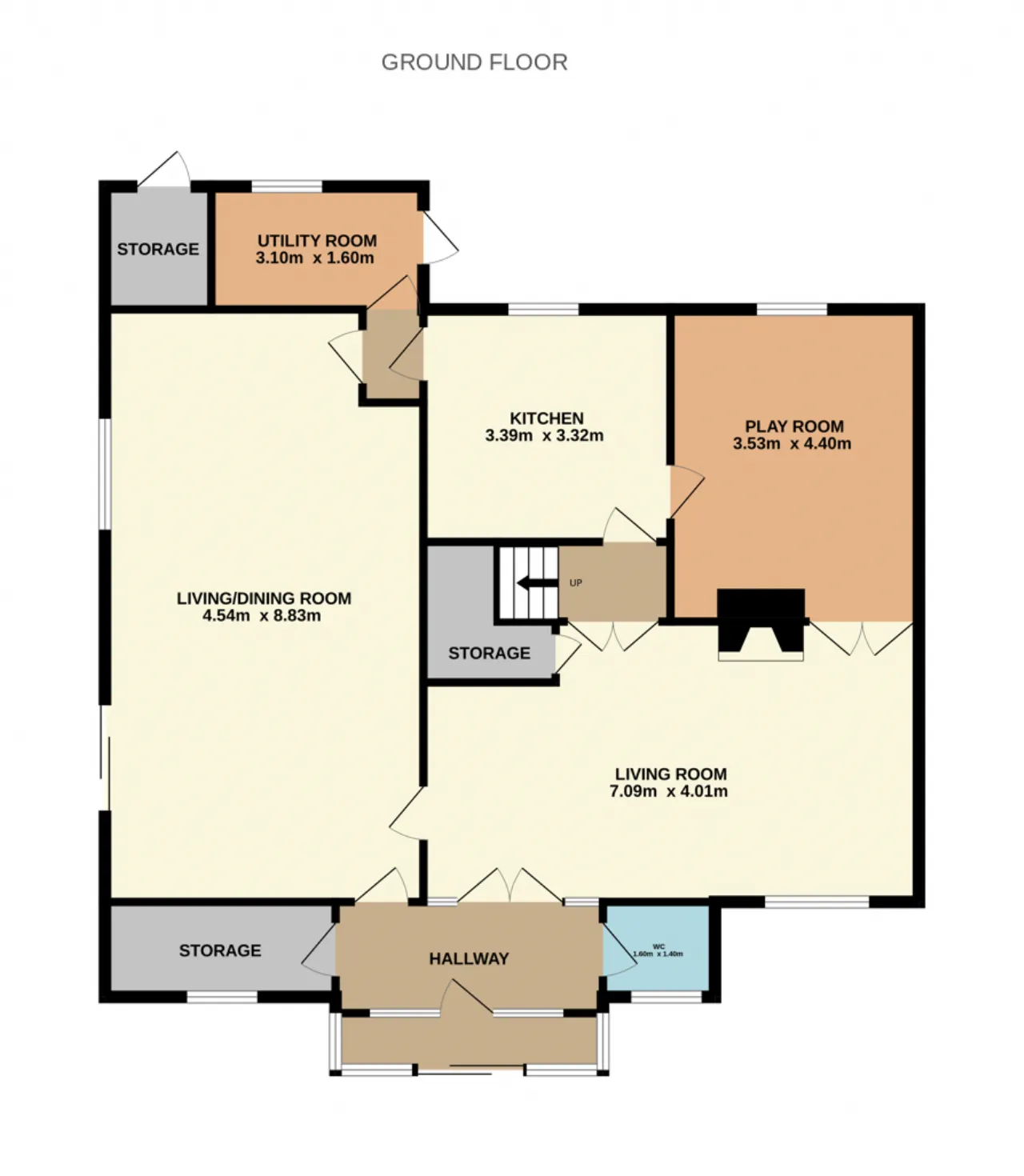 Family room: 7.09m x 4.01m spacious room with carpet flooring, open fireplace and access to under stairs storage.