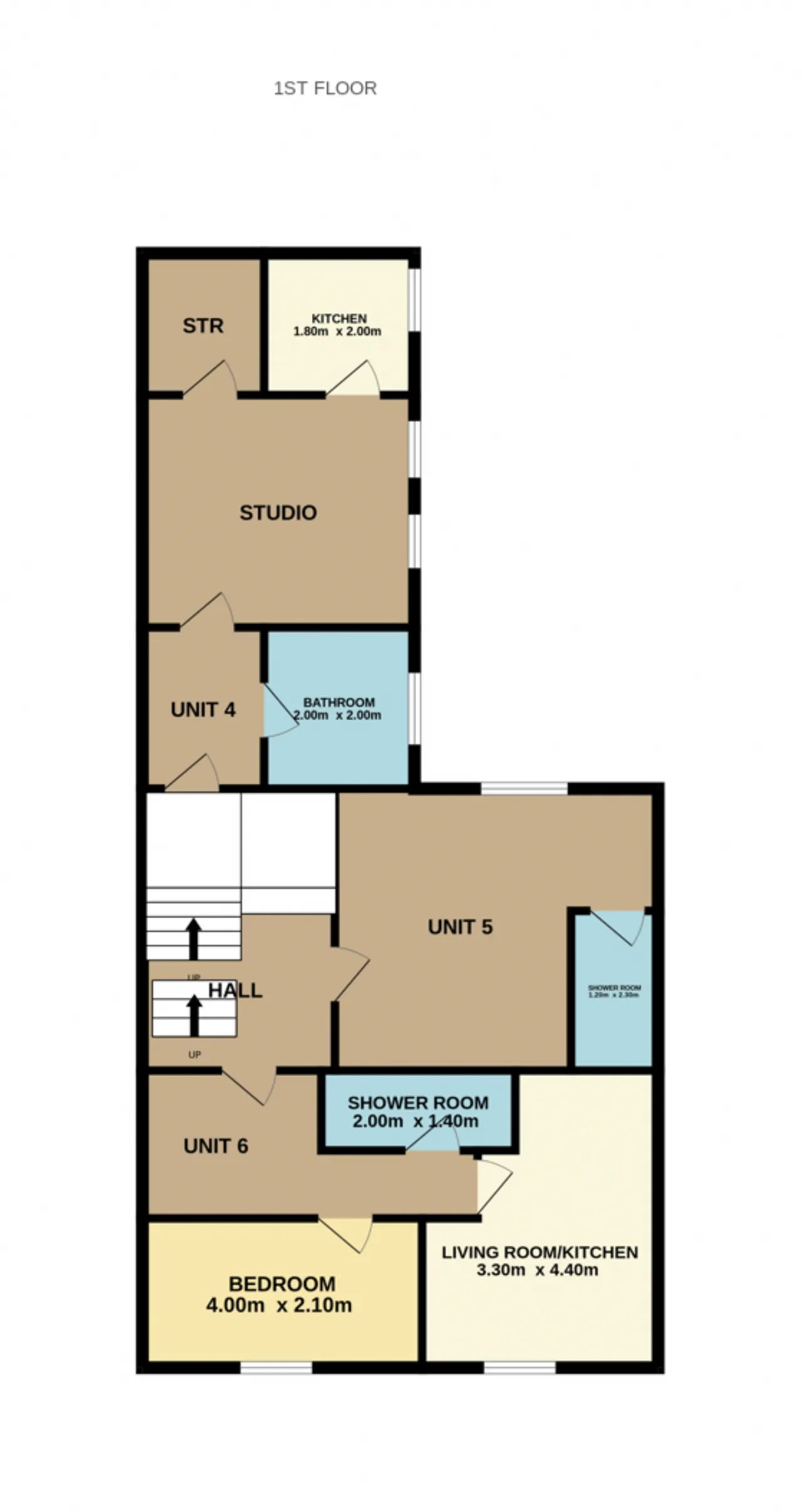Studio 4.3m x 4m Located on the second floor and fitted with floor and wall units.
