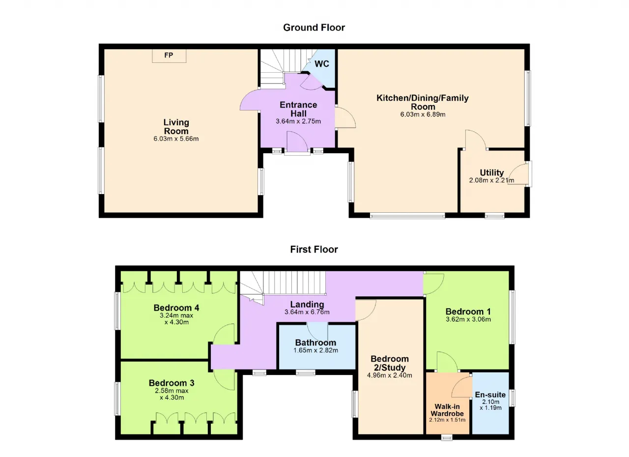 The property is arranged over two levels, providing a wonderful balance between living and sleeping accommodation. The entrance door is to the side with paved walkway and leads into a bright hall with guest WC, a generous kitchen/breakfast/family room, a utility room, and a spacious living room featuring an attractive fireplace. On the first floor, there are four spacious double bedrooms (one en suite), and a family bathroom.