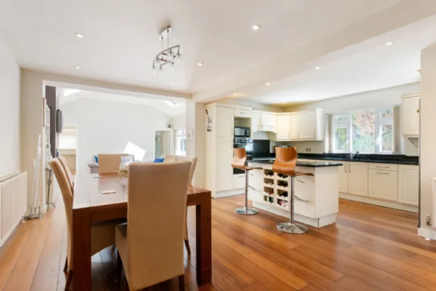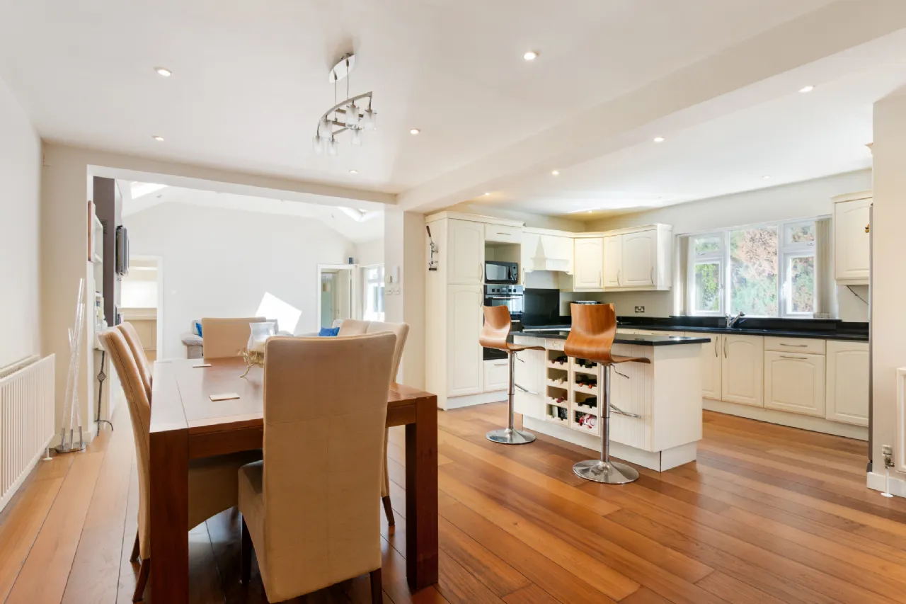 Kitchen/dining room 6.38m max x 5.95m walnut American engineered wood flooring throughout, floor and eyelevel cabinets, black granite worktops, with one and a half stainless steel sink unit, induction five ring hob, extractor fan, double oven, integrated fridge freezer dishwasher, recessed lighting, central light