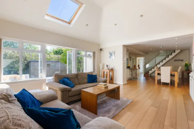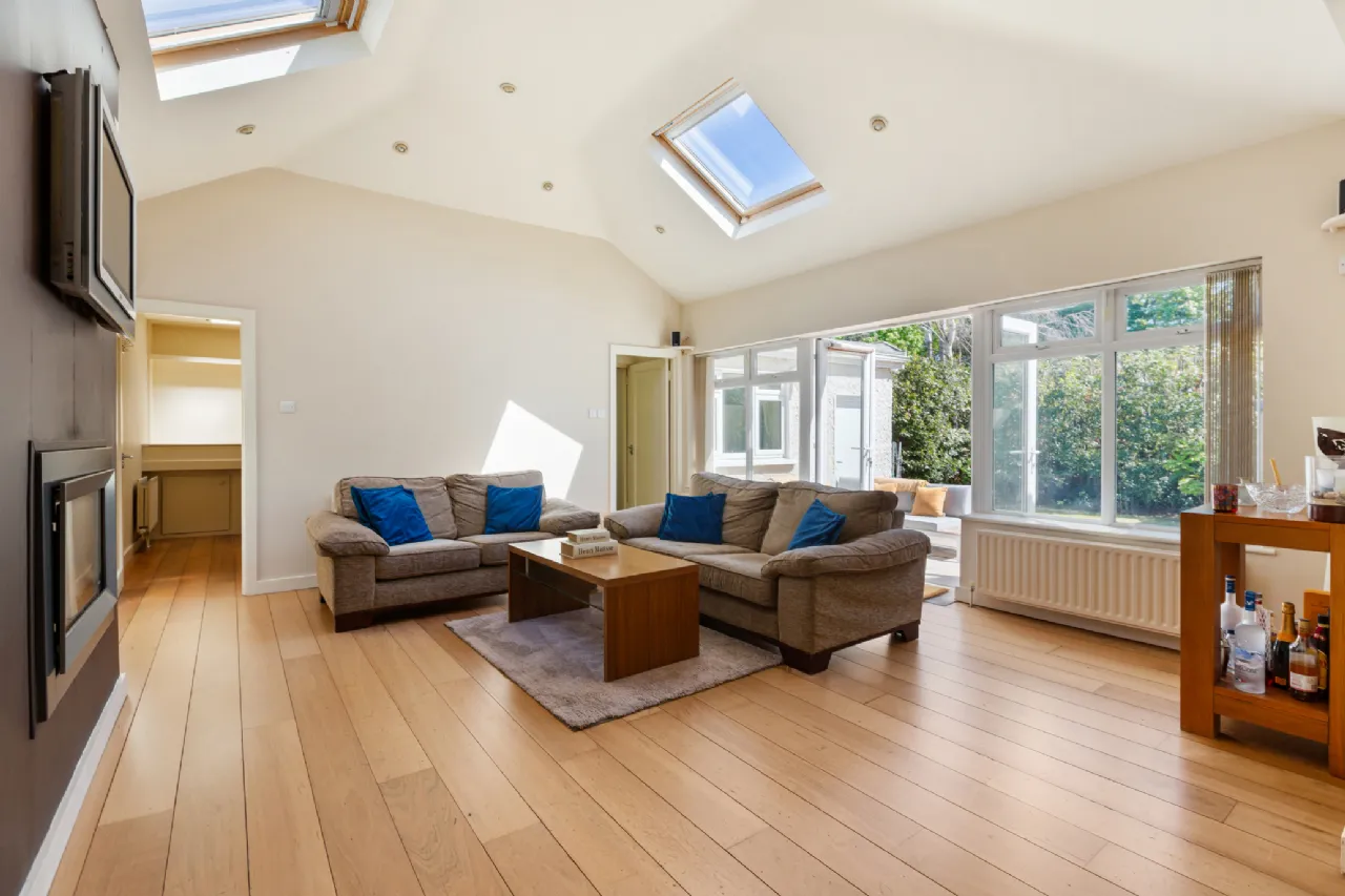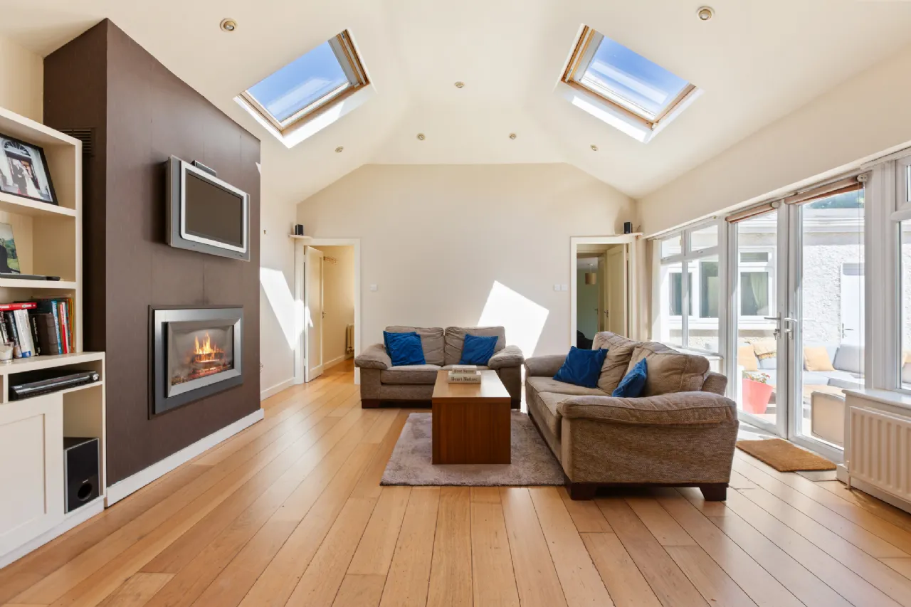 Living room/self contained studio 6.5m x 4.37m American walnut engineered wood flooring, feature stone fireplace with gas fire stone insert, central light, two velux windows, door to: