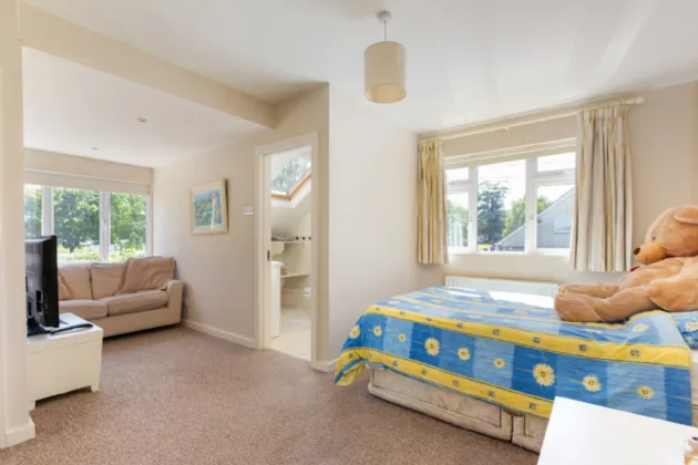 The self-contained studio apartment, accessible both via a side passage and from the main house, is intelligently designed to include a kitchenette, en-suite, and built-in wardrobes. This versatile space could serve as an ideal home office, guest accommodation, or even a small business. Additionally, the separate Shomrea building, complete with two individual offices, a kitchenette, and a WC, offers further potential for use in conjunction with a home-based business.