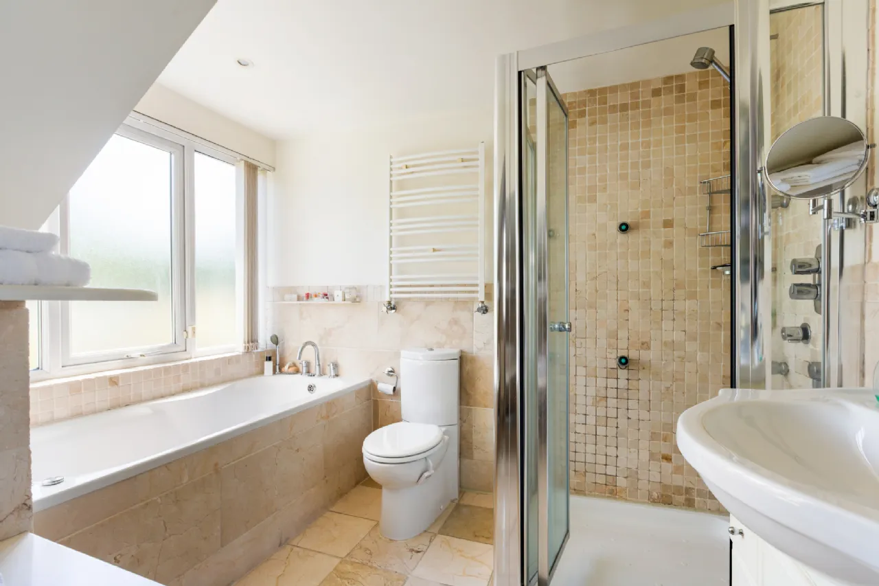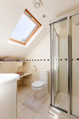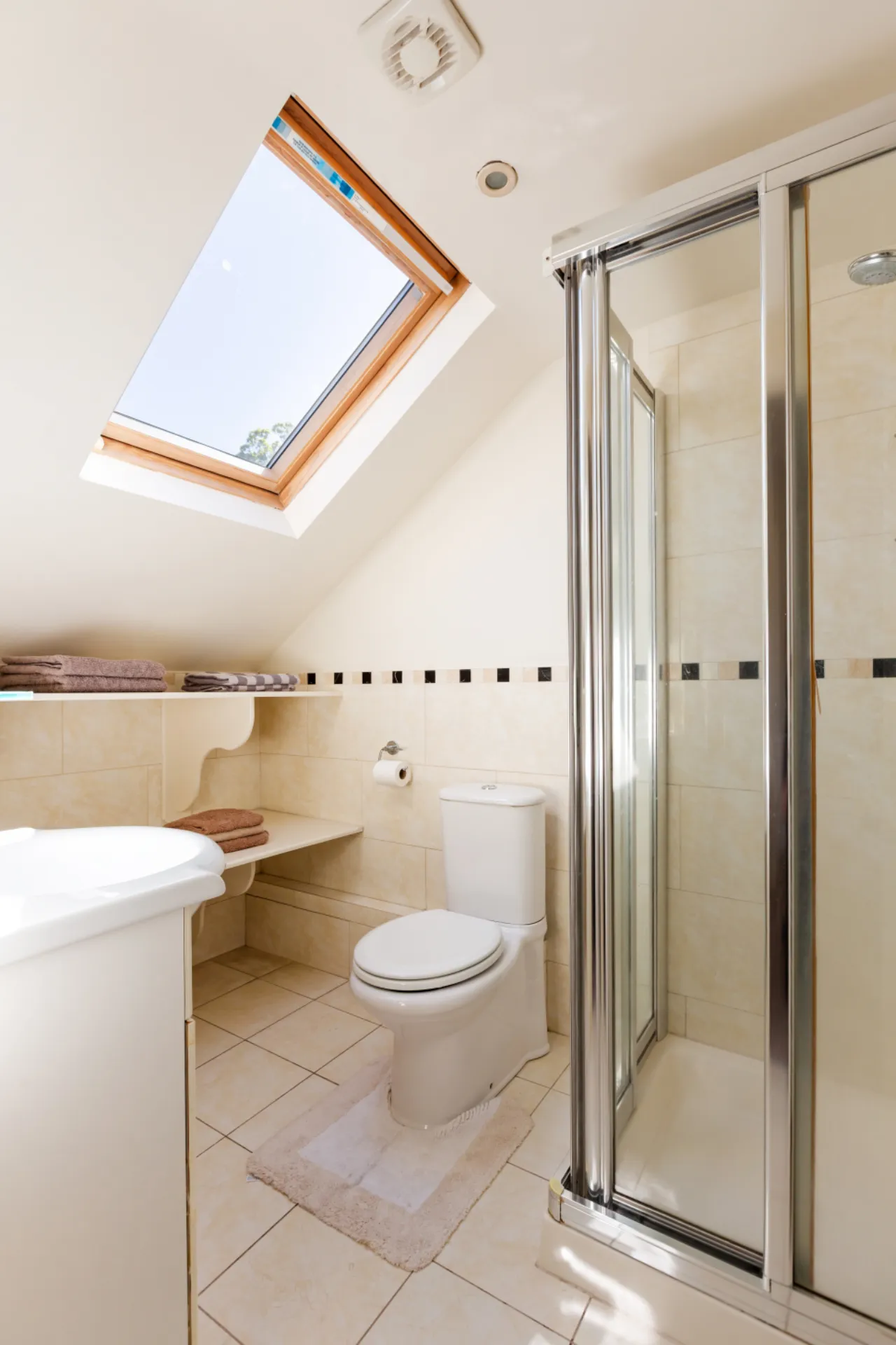 Ensuite 2.50m x 1.70m tiled floors and part tiled walls, corner shower suite, recessed lighting, WC and wash handbasin, Velux window