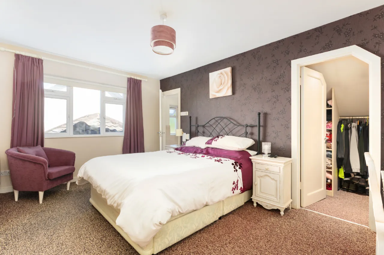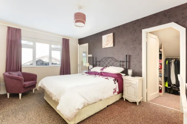 Bedroom Two 5.96m x 4.37m carpet flooring, recessed lighting, built-in wardrobes, attic access via Stira stairs, overlooking front, door to: