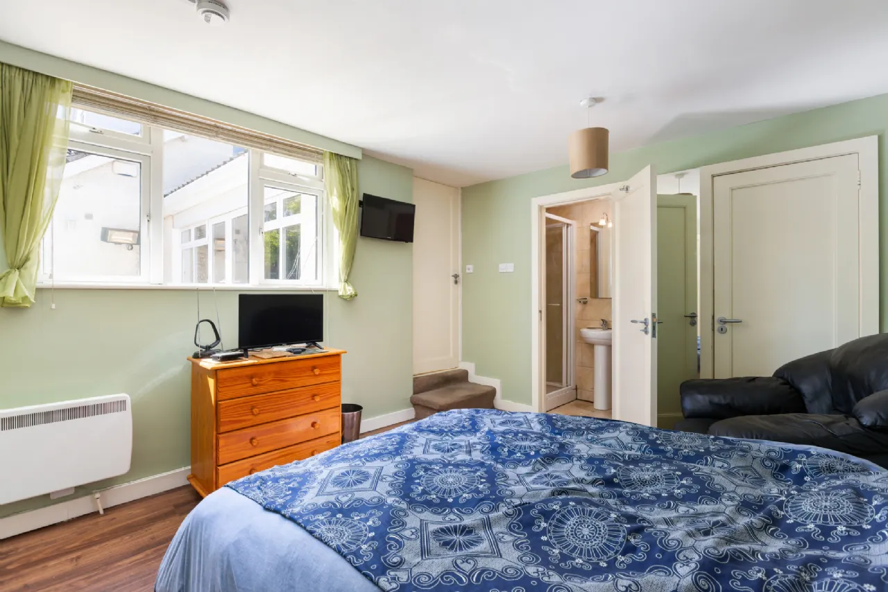 A charming cobblelock driveway, secured by an electric gate and bordered by a lush array of plants and shrubs, leads up to the front door, welcoming you into a home that combines style and functionality. The reception room, located at the front of the property, features a stunning fireplace and ample space. It has been thoughtfully renovated to include a kitchenette and an en-suite shower room, providing the potential for generating rental income if desired.