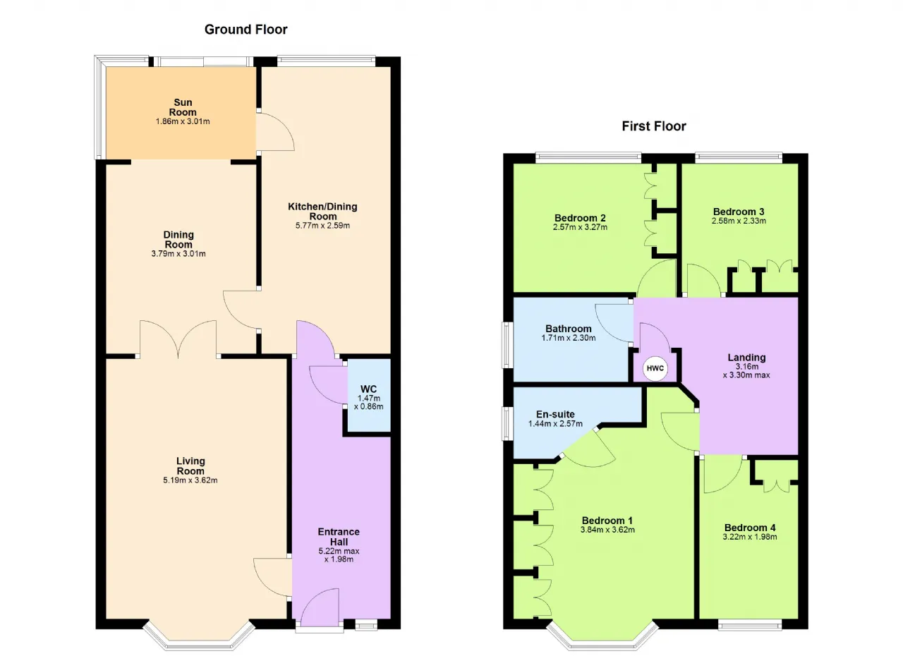 Bedroom one (main) 3.84m x 3.62m Bay window overlooking the front garden, wall to wall built-in wardrobes, door to: