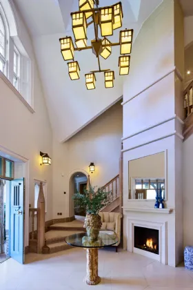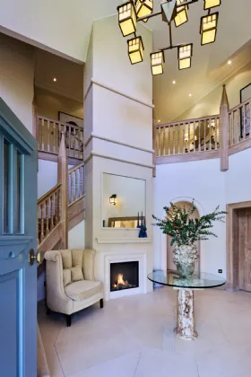 The accommodation extending to 478.51 sqm/5,150 sqft approx. is appointed to the highest specification with underfloor heating, extensive use of solid limed oak joinery, limestone flooring and sandstone contemporary fireplaces to name a few. The attention to detail is exceptional. On entering the hall with vaulted ceiling and copper chandelier, a sandstone fireplace with double height sandstone chimney draws the eye upwards, to the galleried landing with limed oak banisters, setting the tone for what lies within. Externally the slate roof with attractive bargeboards, sash windows, part brick part render finish, combined with a well-appointed two storey octagonal sunroom with cupola to the side creating a tower-like vision providing both light and interest, all combine to make this a most attractive family home.