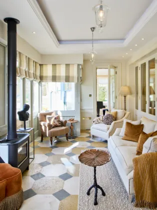 Sunroom View out to the gardens, accessed via French doors. Remote controlled Gazco stove. Recessed lighting detail and ceramic tiled floor. Door to:
