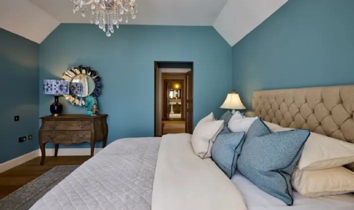 Bedroom 4 Bespoke wardrobes and shelving detail complimented by a vanity unit and wall mirror with recessed lighting. Wide plank oak floor.