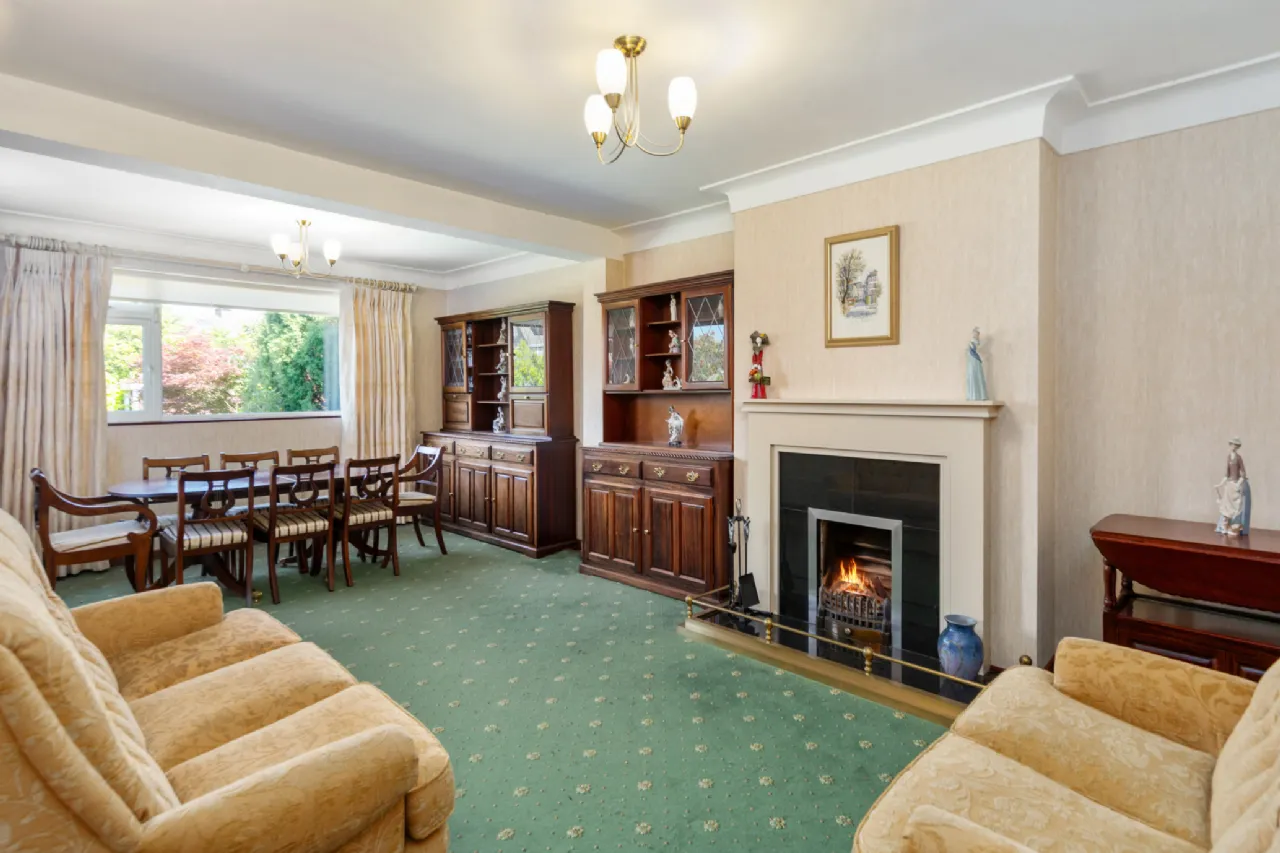 Lounge/Dining Room 6.82m x 3.75m central light, wall lights, carpet flooring, open fireplace with granite hearth and insert and stone mantle and surround, dual aspect to rear garden