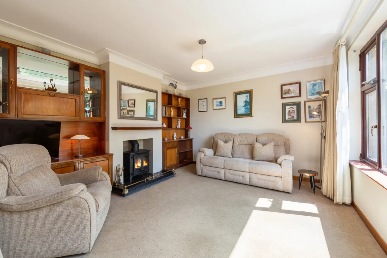 Living Room 3.87m x 4.12m carpet flooring, central light, multi fuel stove with wooden mantle and stone hearth, picture window overlooking manicured front garden.