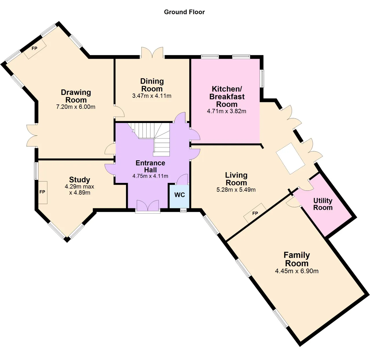 Family Room 4.45m x 6.90m Tiled floor, feature marble surround fireplace with multi fuel burning stove inset, recessed lighting, two sets of double doors to garden