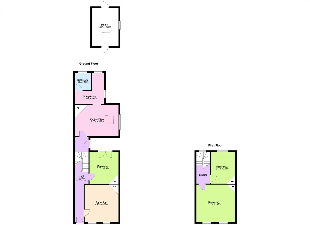 Studio 4.56m x 3.25m Light filled fully insulated studio with double glazed double doors on either end of the unit, wired for electricity.