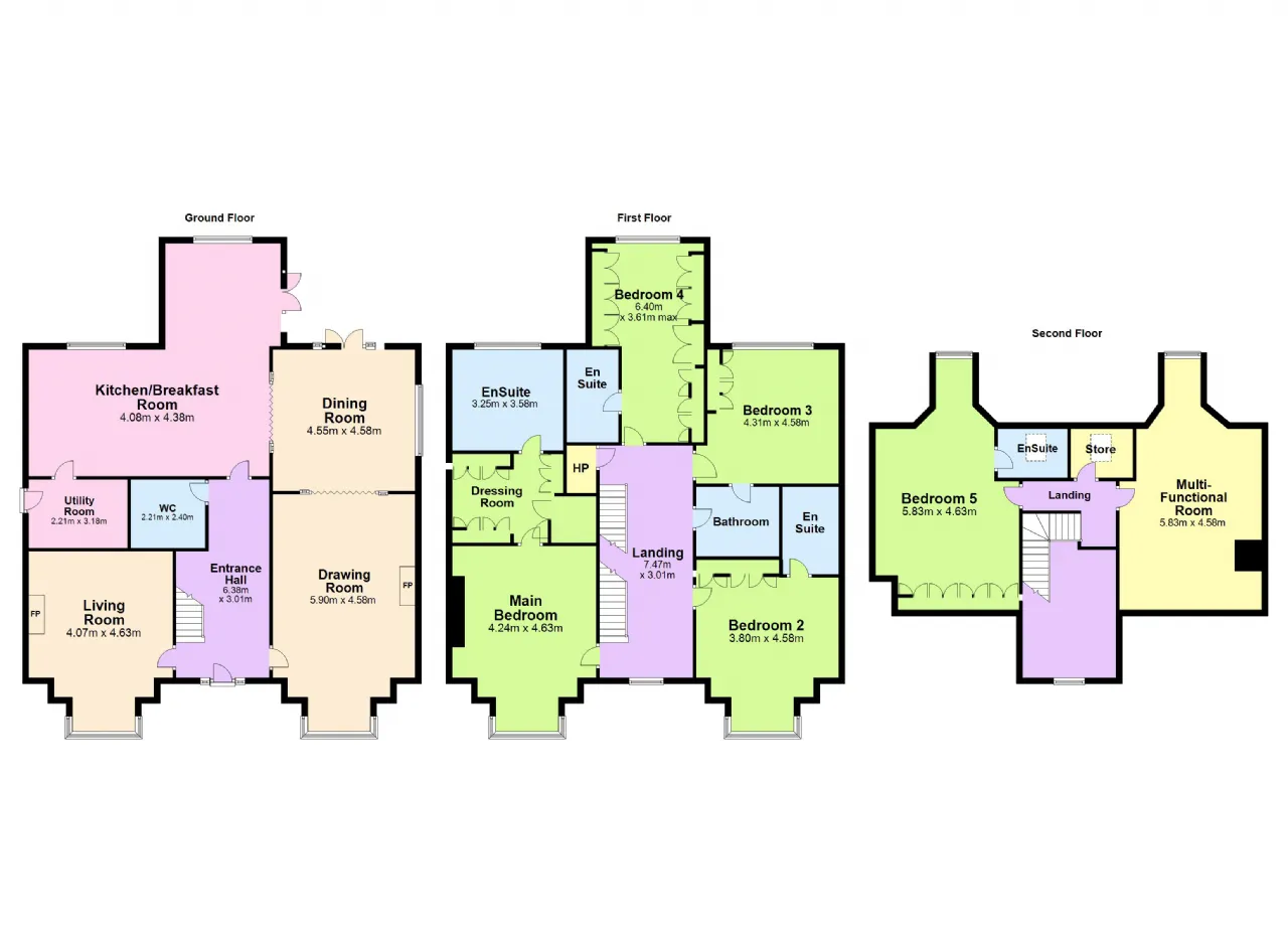 The second floor offers further flexibility, comprising a large multi-purpose room and a fifth ensuite bedroom, along with excellent storage solutions, including extensive eaves access and a cleverly designed luggage nook with a skylight and additional hidden storage.