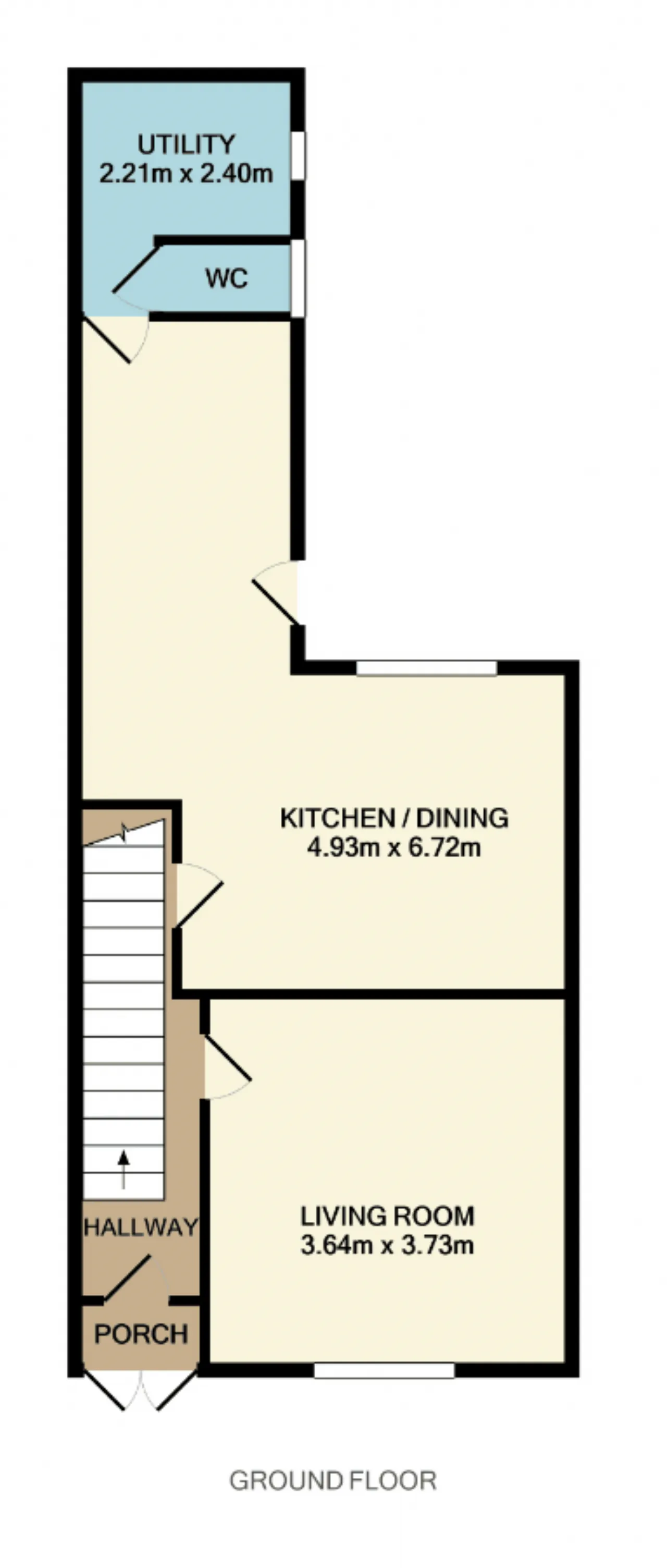 Kitchen/Dining Room 4.93m x 6.72m Windows to the rear, original timber floors in dining area, along with original fireplace. The kitchen is fitted with matching base/wall units, ample worktop space, built in electric oven with gas hob above, stainless steel sink with mixer tap, space for fridge freezer, rear door to garden and tiled floor coverings.