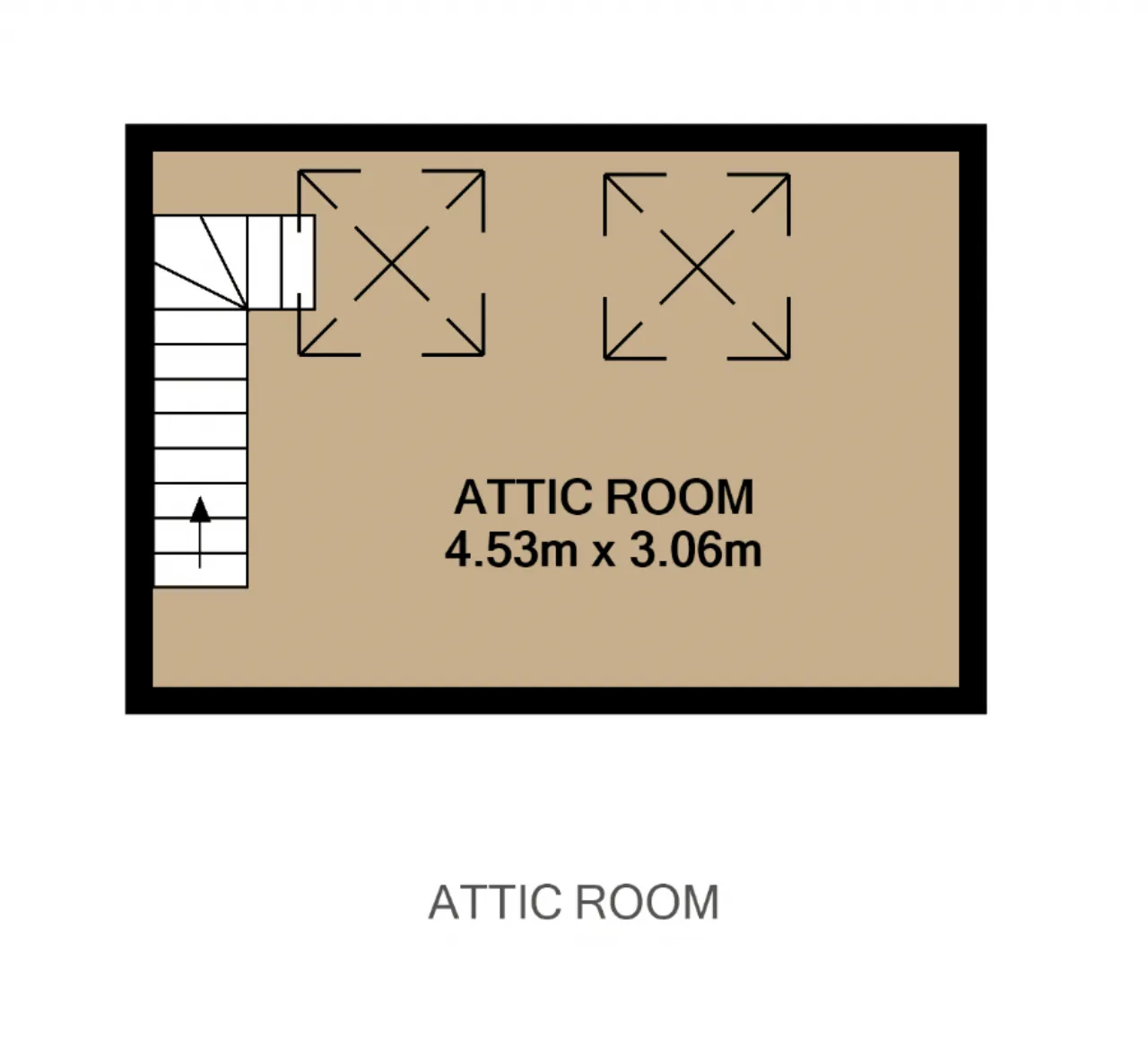 Attic 4.53m x 3.06m Built in eve storage, Velux roof light and timber flooring.