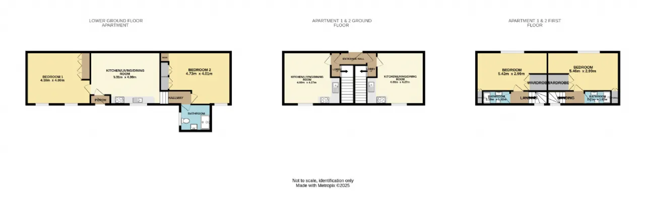 The upper levels of the property are divided into two stylish one-bedroom duplex apartments, each arranged over two floors to create a sense of space and separation. Both units benefit from modern kitchens, open-plan living, double bedrooms with built-in storage and ample bathrooms.