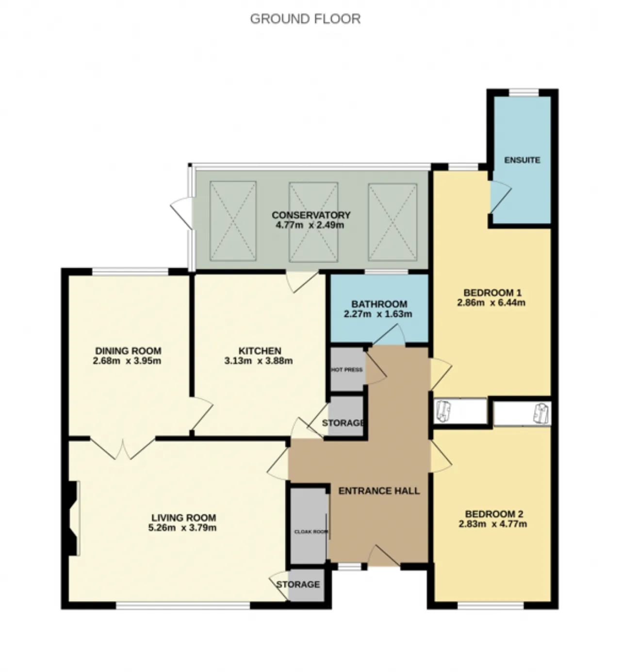 Bedroom 2 2.83m x 4.77m Double bedroom with carpet flooring, window to front, radiator and fitted wardrobes.