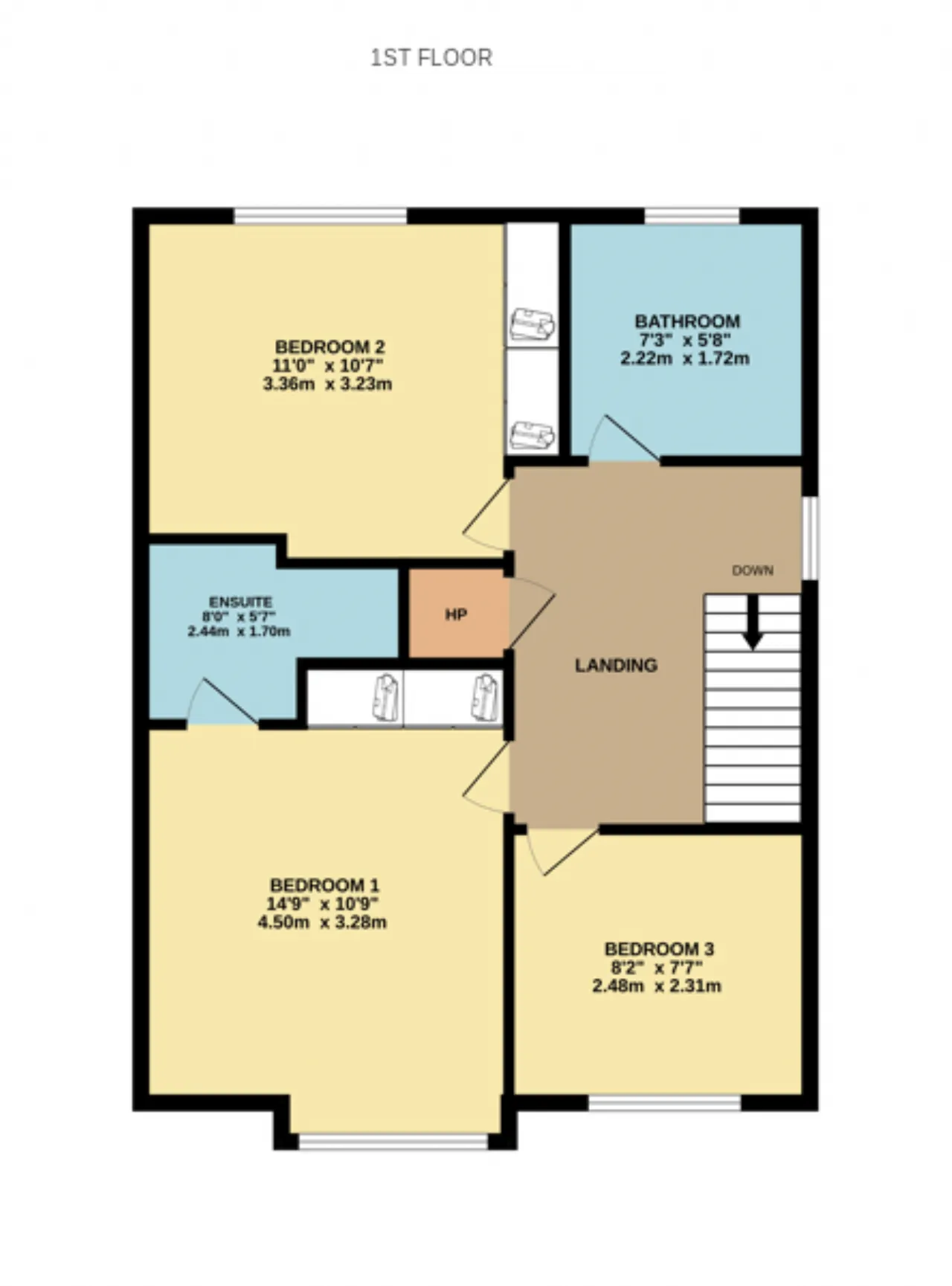 Bedroom 1 4.5m x 3.28m A generous double bedroom located to the front of the house, complete with built-in wardrobes.