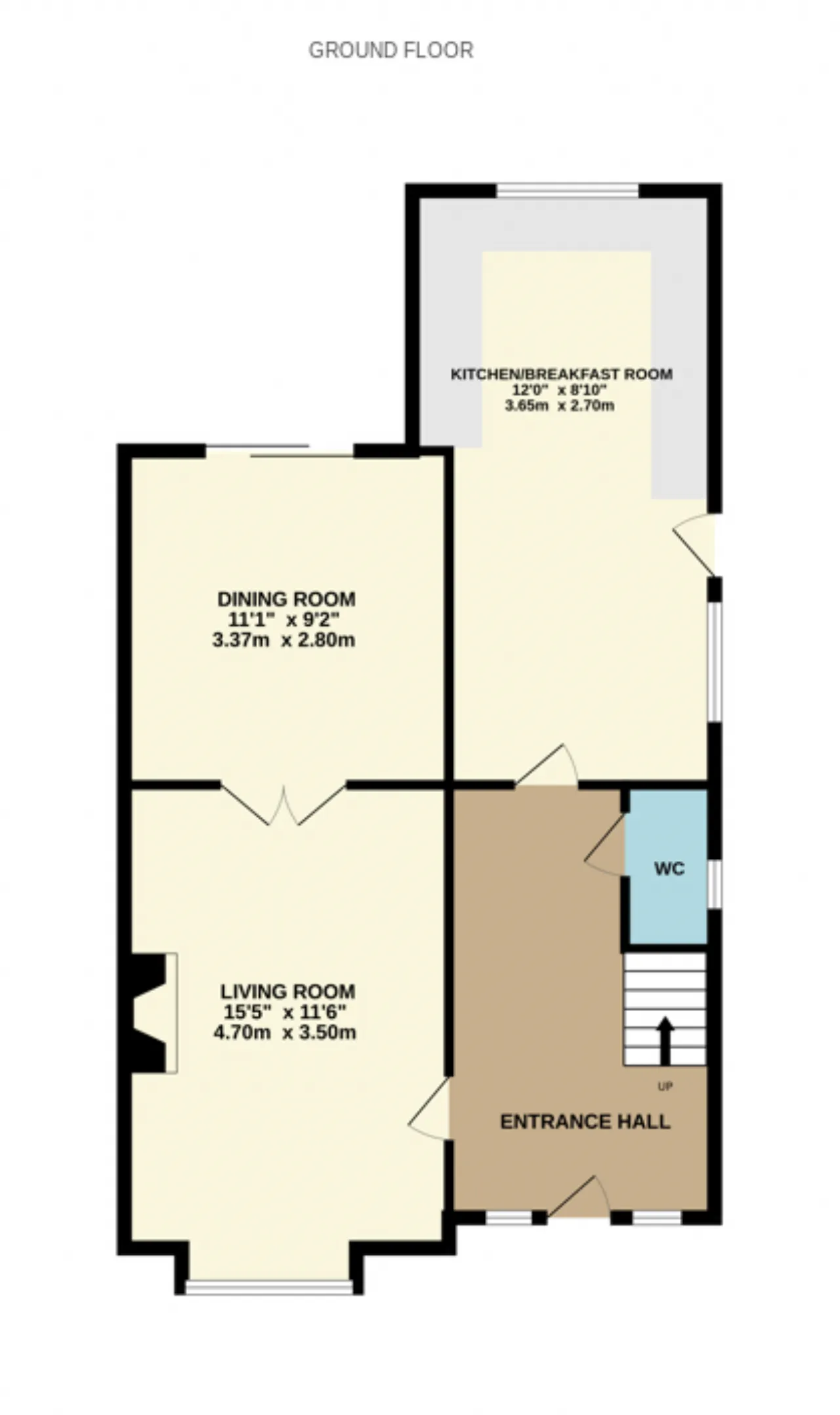 Living Room 4.70m x 3.50m A spacious reception room to the front of the house, featuring a fireplace and wood flooring.