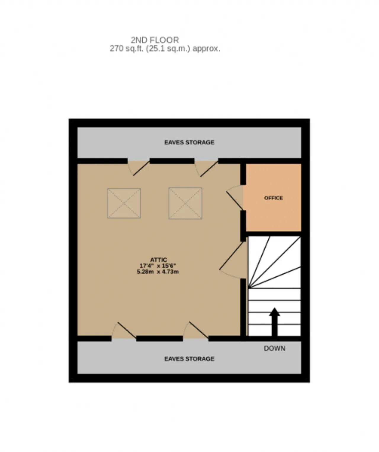 Attic 4.77m x 5.28m A bright and spacious converted attic, offering a versatile additional room with sloped ceilings, multiple Velux windows, and consistent laminate flooring