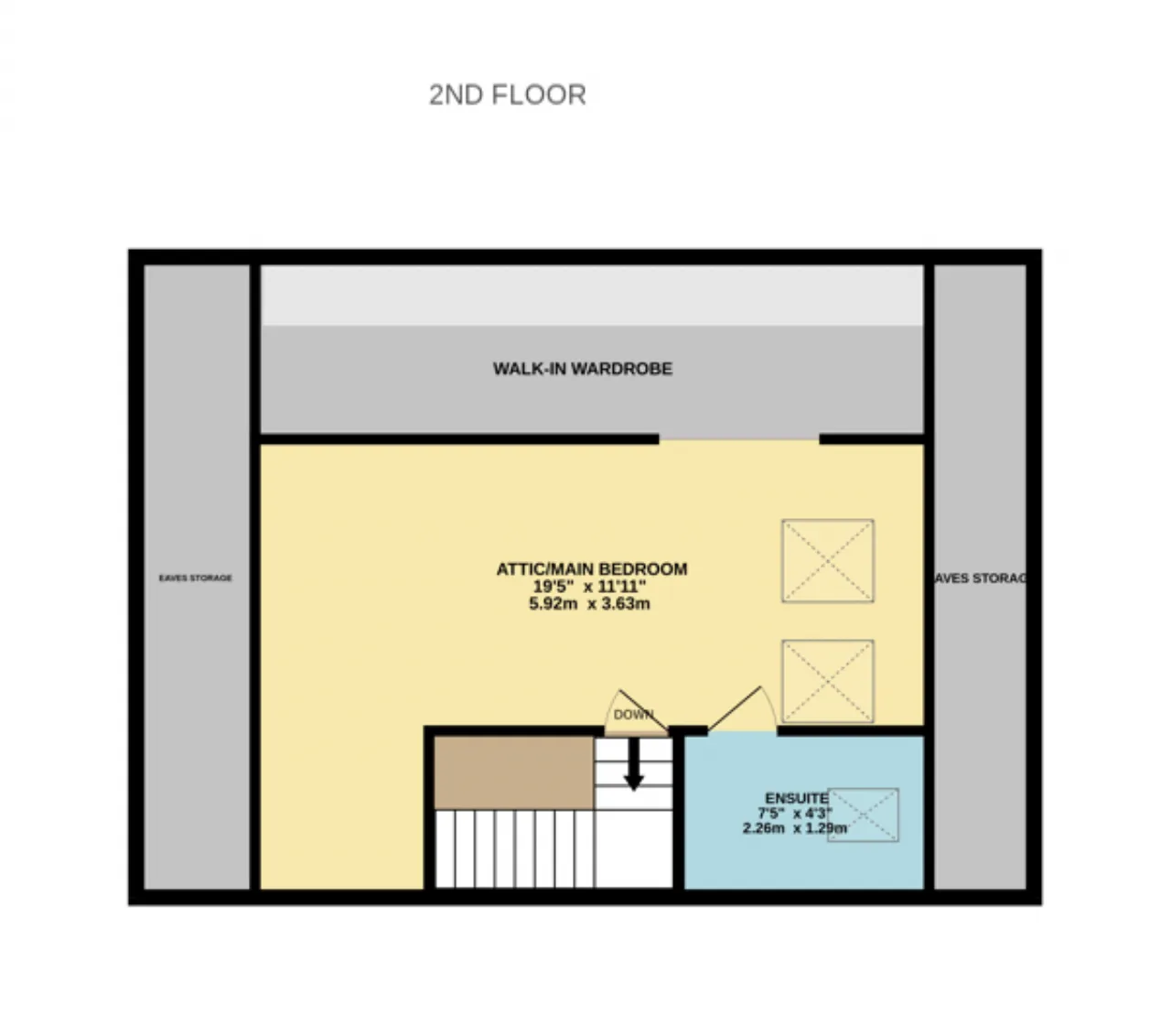 Attic conversion (Main bedroom) 5.92m x 3.63m Situated on the top floor, this state-of-the-art attic conversion currently serves as the main suite. The space features a striking media wall with an integrated feature fireplace, a lavish custom-built headboard flanked by floor-to-ceiling mirrors, an exclusive vanity table with storage, and a luxurious walk-in wardrobe with bespoke LED-lit storage. Completing this suite is a stylish en-suite bathroom and Velux windows that flood the room with natural light.
