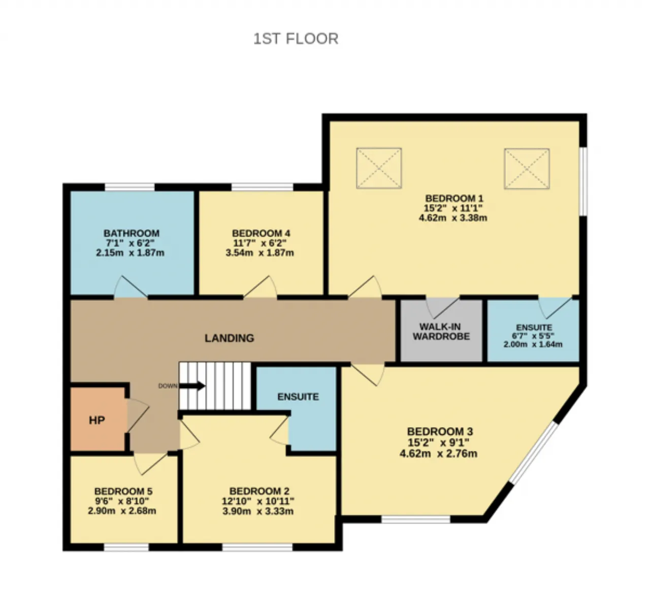 The first floor provides five bedrooms in total: three generous double bedrooms and two comfortable single bedrooms, catering to a large or growing family.