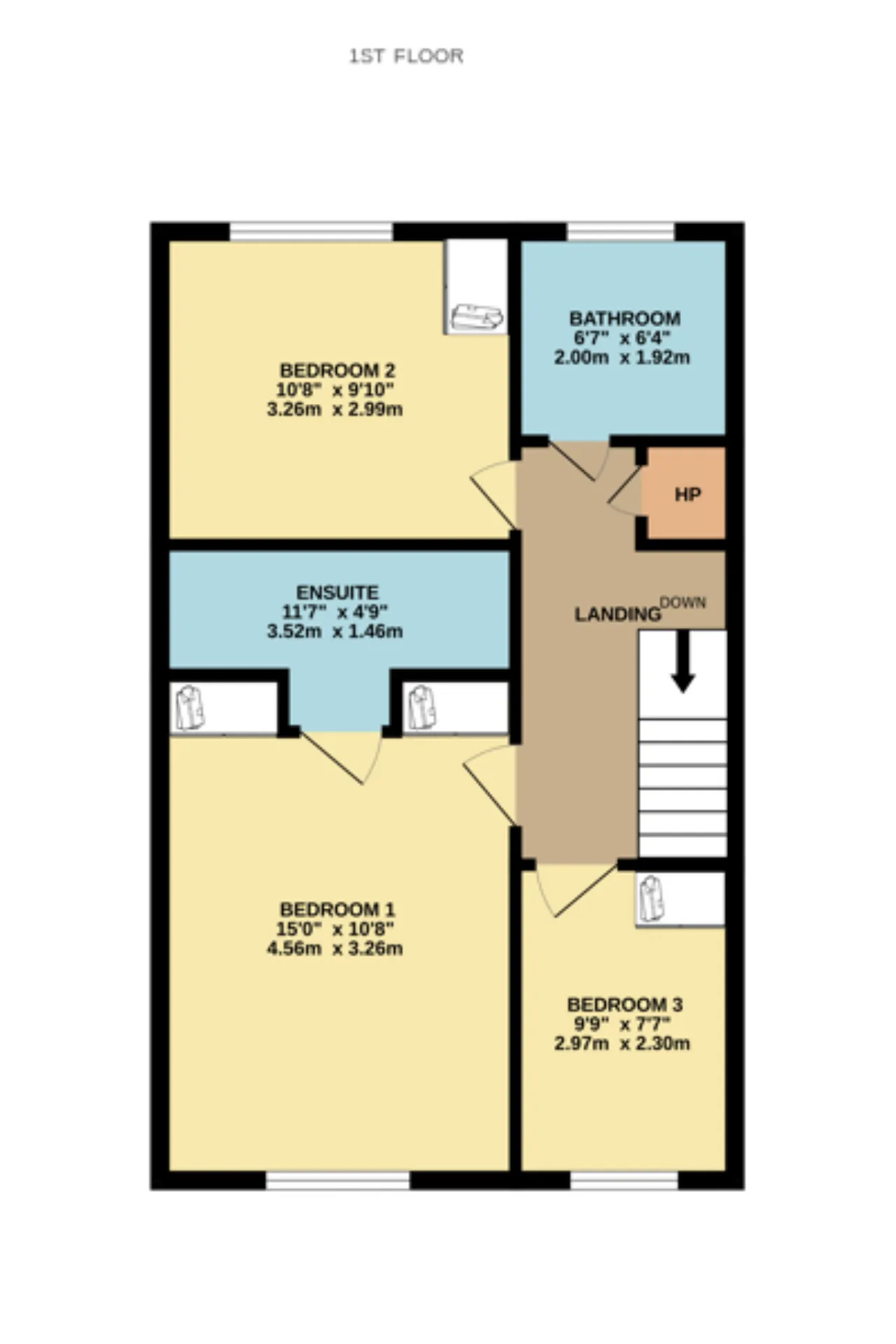 Bedroom 1 2.99m x 4.56m A generous double bedroom with laminate flooring, built-in wardrobes, and a private en-suite bathroom.