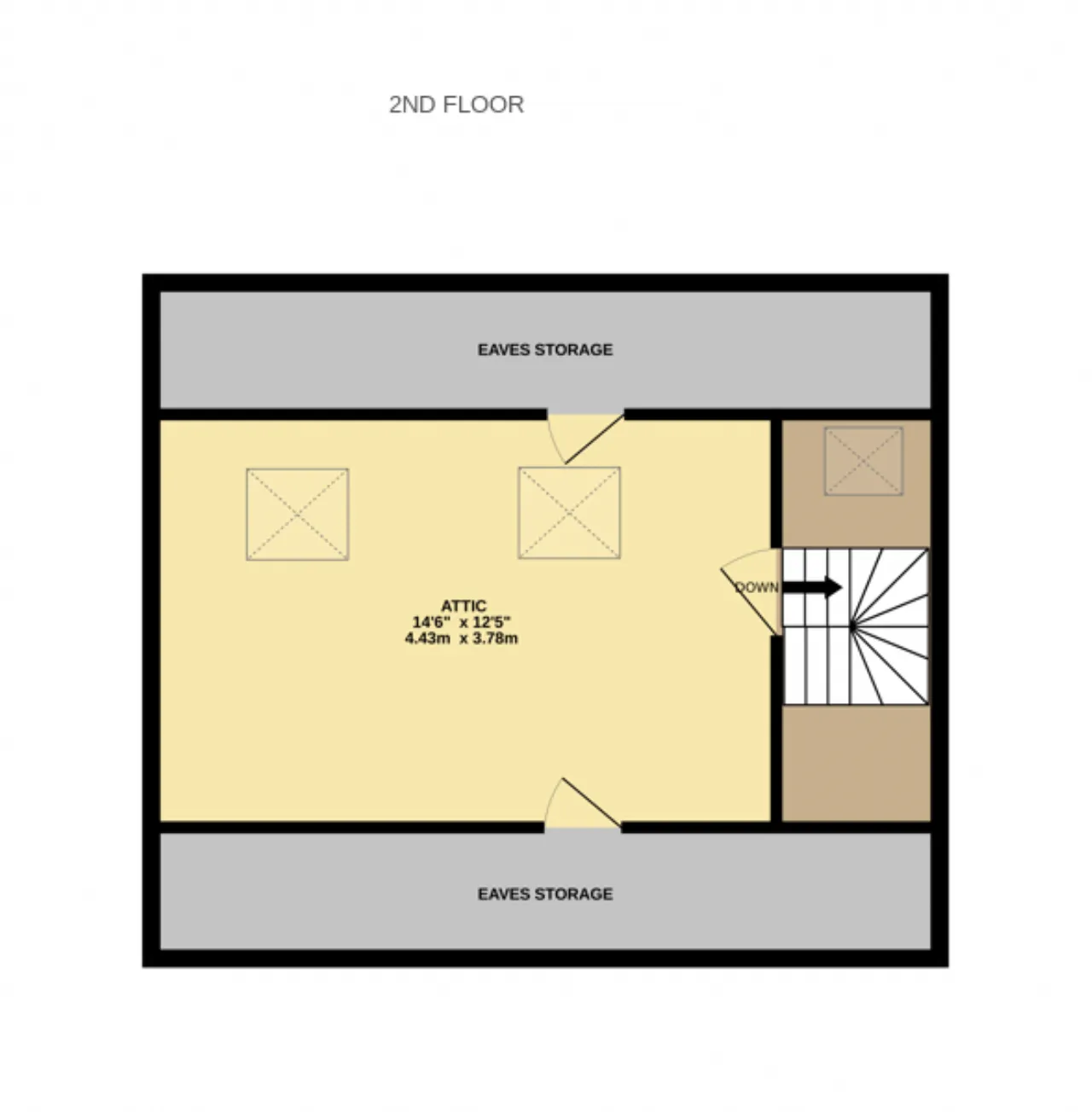 Converted Attic 4.42m x 3.78m A finished, versatile space with sloped ceilings, exposed wooden floorboards, and natural light from Velux-style windows, currently accommodating both sleeping and a designated desk/work area.