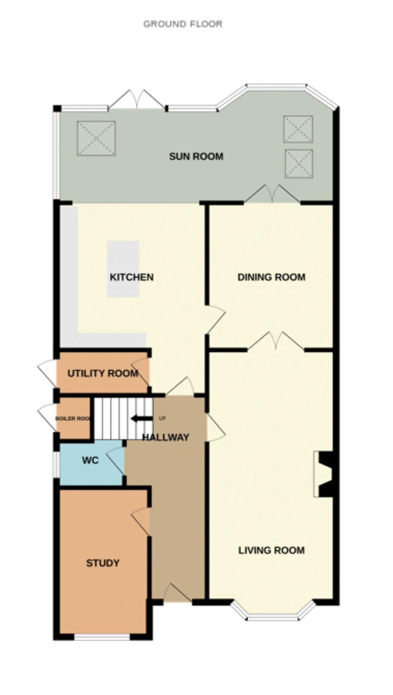 Behind its distinctive white façade lies superbly proportioned family accommodation extending over two floors. A welcoming reception hall sets the tone, leading to a series of well-balanced living spaces. The ground floor comprises three generous reception rooms, ideal for both formal entertaining and relaxed family living, along with an excellent fitted kitchen and separate utility room. To the rear, a large sun room provides an additional light-filled living space, with double doors opening directly onto the beautifully landscaped private rear garden. A guest WC completes the ground floor accommodation.