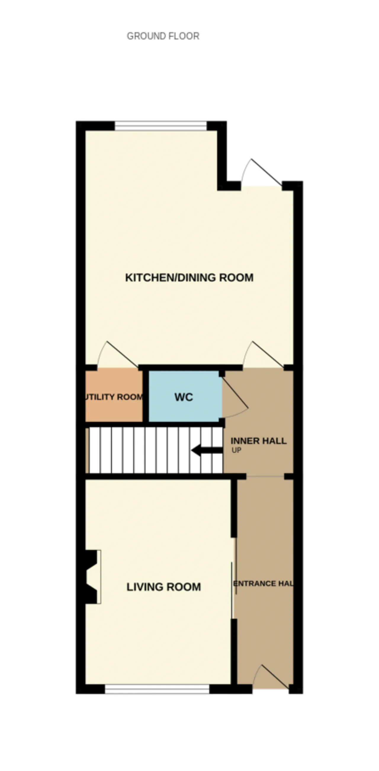 On the first floor, there are two spacious double bedrooms — both extending the full width of the house and fitted with built-in wardrobes — together with a well-appointed family bathroom.
