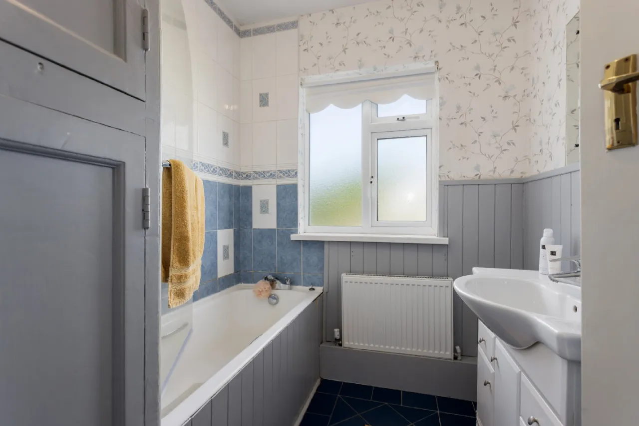 Bathroom 2.76m x 2.22m With tiled floor, partially tiled & panelled walls, bath with Triton T90sr shower over, wash hand basin set into vanity unit with excellent storage below, shelved hotpress with dual immersion and Ideal Logic System s24IE gas boiler with digital controls