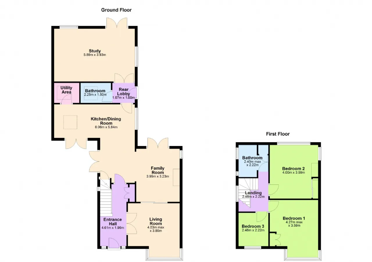 Family Room 3.95m x 3.23m Reception room leading from the front room, original wood flooring, open fire place, double glass doors leading to back garden, side window for further light. Open into kitchen.