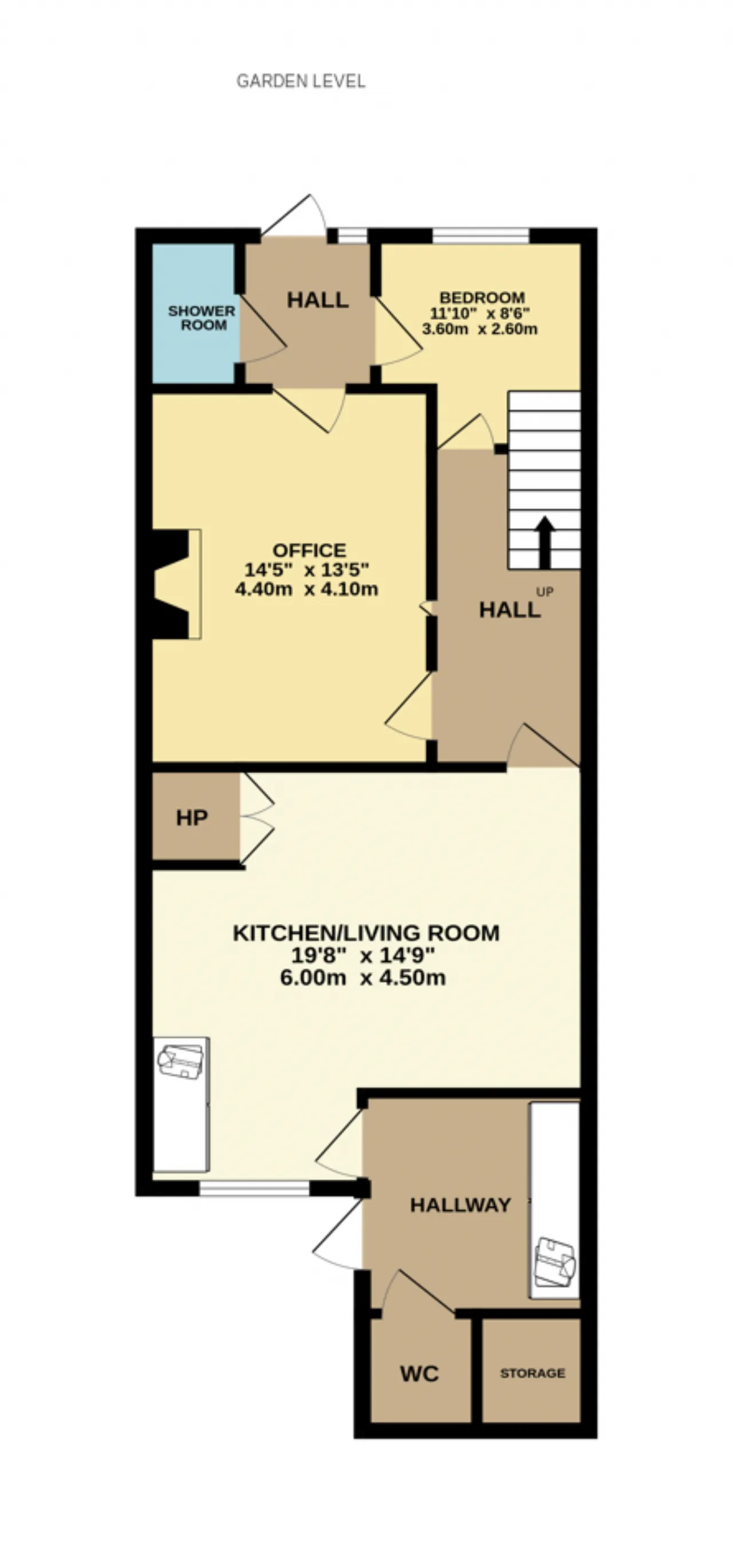 Office 2.60m x 3.60m Could be used for a variety of purposes with carpet flooring, feature fireplace and steps to an inner hallway and garden access.